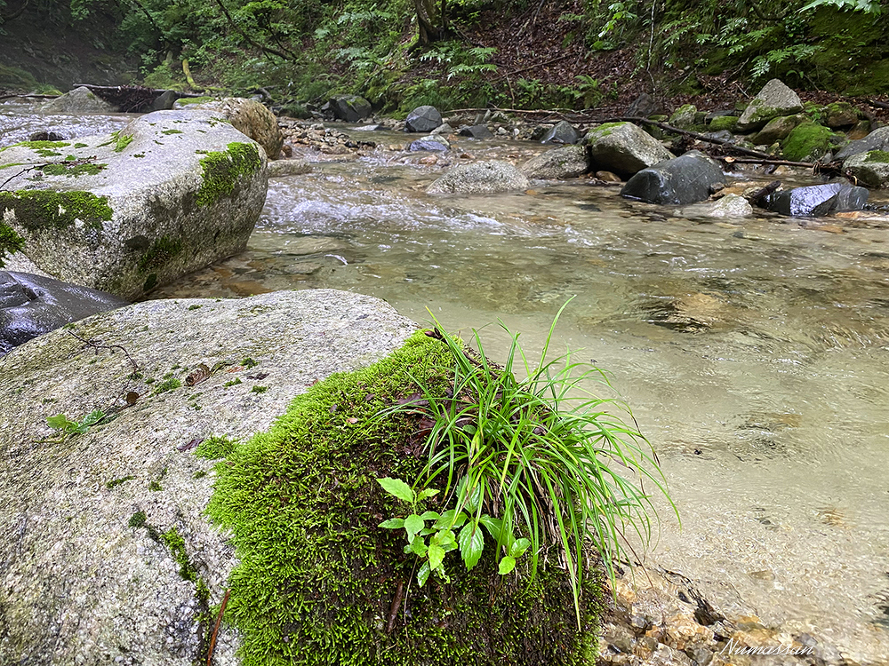 水辺の丸石の上部、帽子をのせたような苔草をクリアな水音が包んでいる…