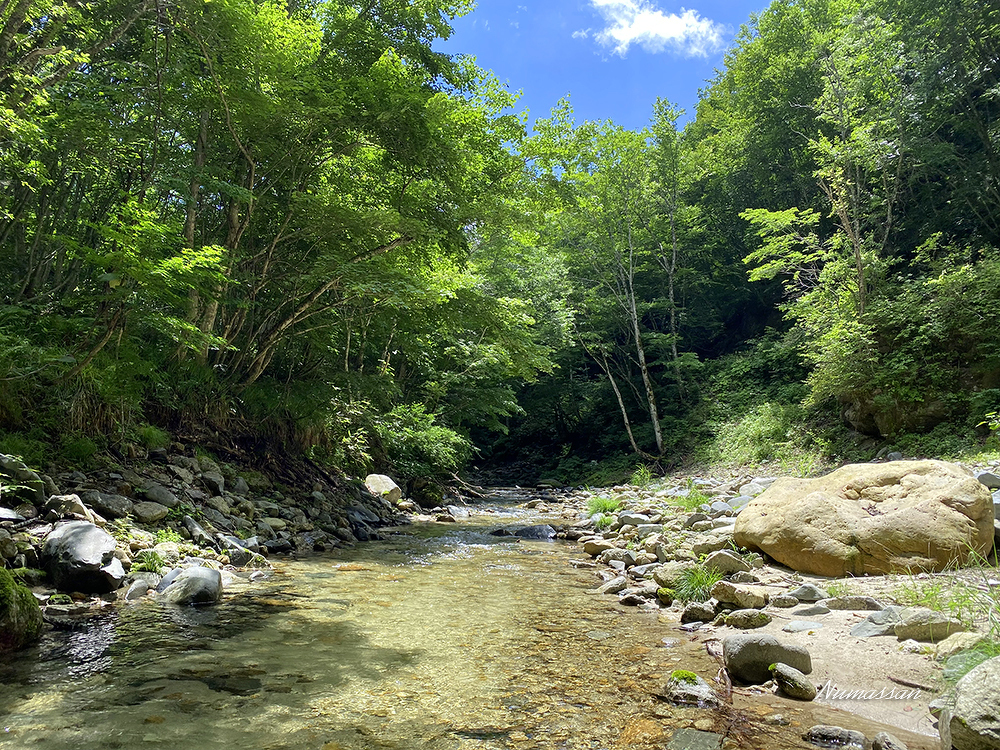白い底石、勾配は緩く浅めでフライフィッシング向きの渓流。