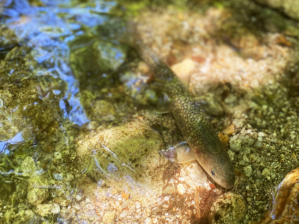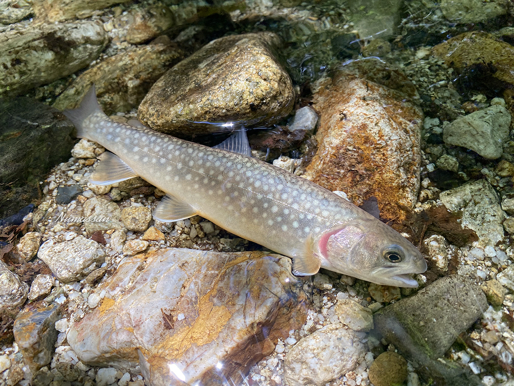 サイズは7寸(約21cm)クラスが多いが、ここのイワナは白い底石に紛れ込むように色白。