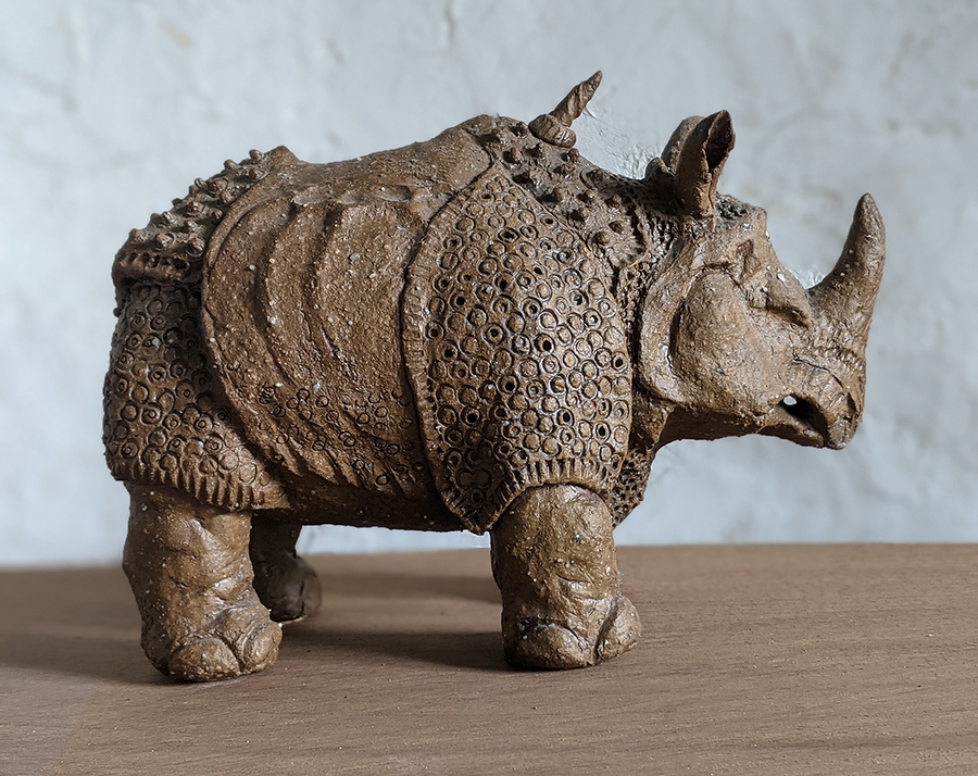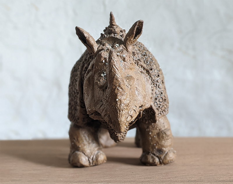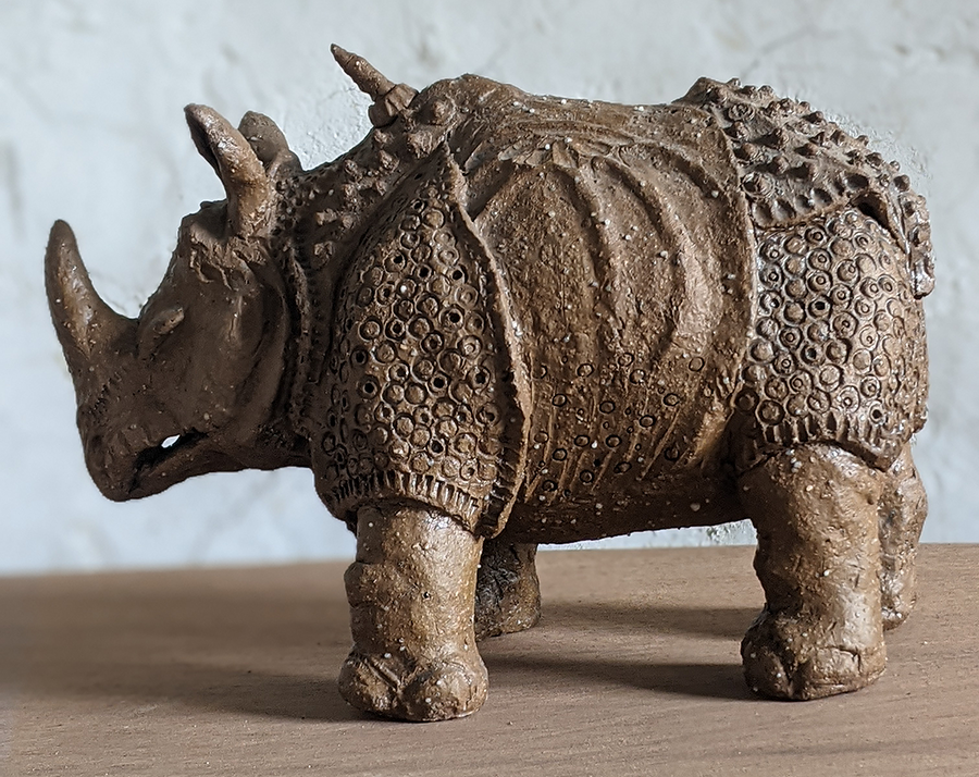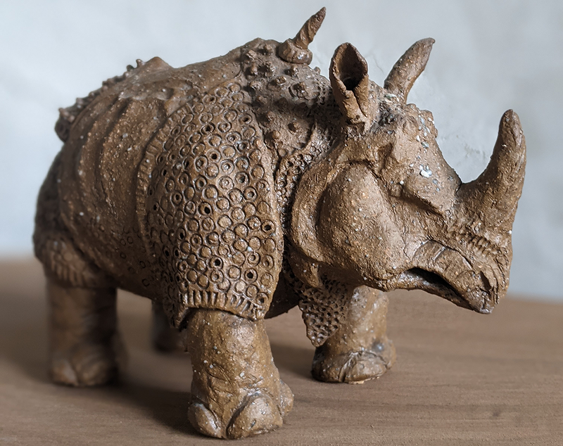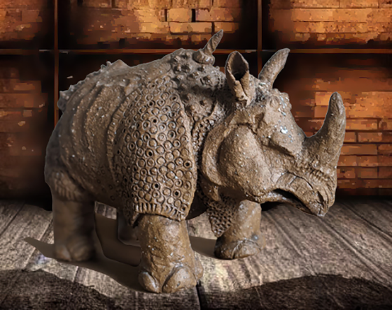 一部サイの持つ勇猛さを表現するためアレンジした部分があります。 サイの特徴をデフォルメするとこうなるのかとおもっていましたが、船員の見たサイは、荷物室の最悪環境下にいた為、皮膚病にかかっていたそうです。