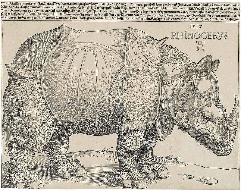 この作品のベースになるのは 1515年にアルブレヒト・デューラーが、サイを見たことのある船員からサイの話を聞き、彼の想像の中から描かれたサイの木版画がベースとなっています。