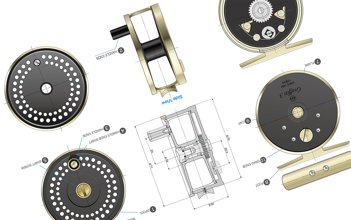 「Graffiti 3」の開発は、2023年春にデザイン図面化を開始しました。代表 沼田は、自身が長年愛用してきたフライリールへの想いと、本当に必要とされる機能、そして何よりも信頼できる丈夫さを追求しました。