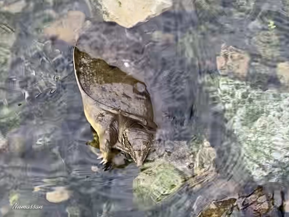 いきなりのヒットがなんとスッポン!甲羅の柔らかい縁にフッキング、外してあげるとみるみる泳ぎ去ったのでした。