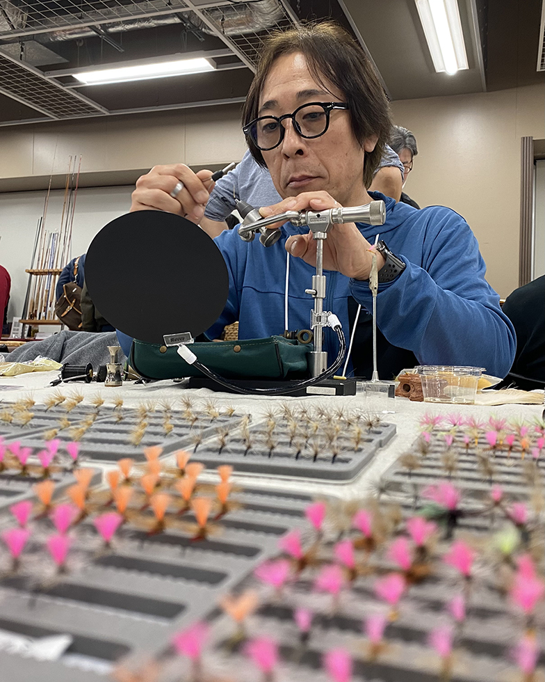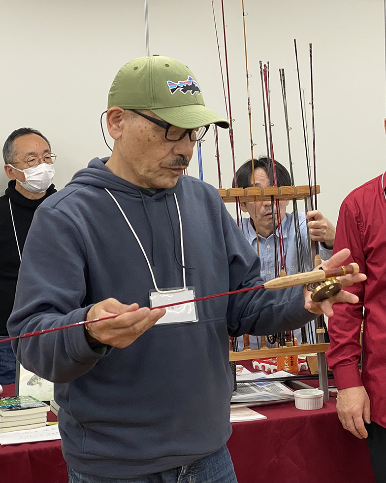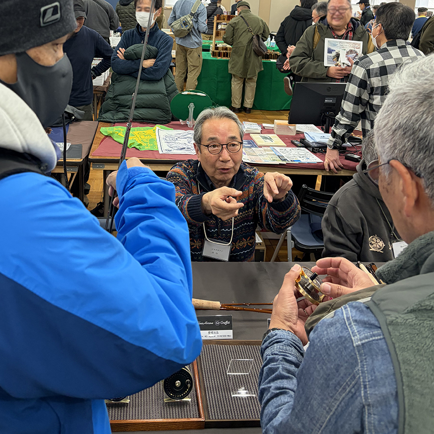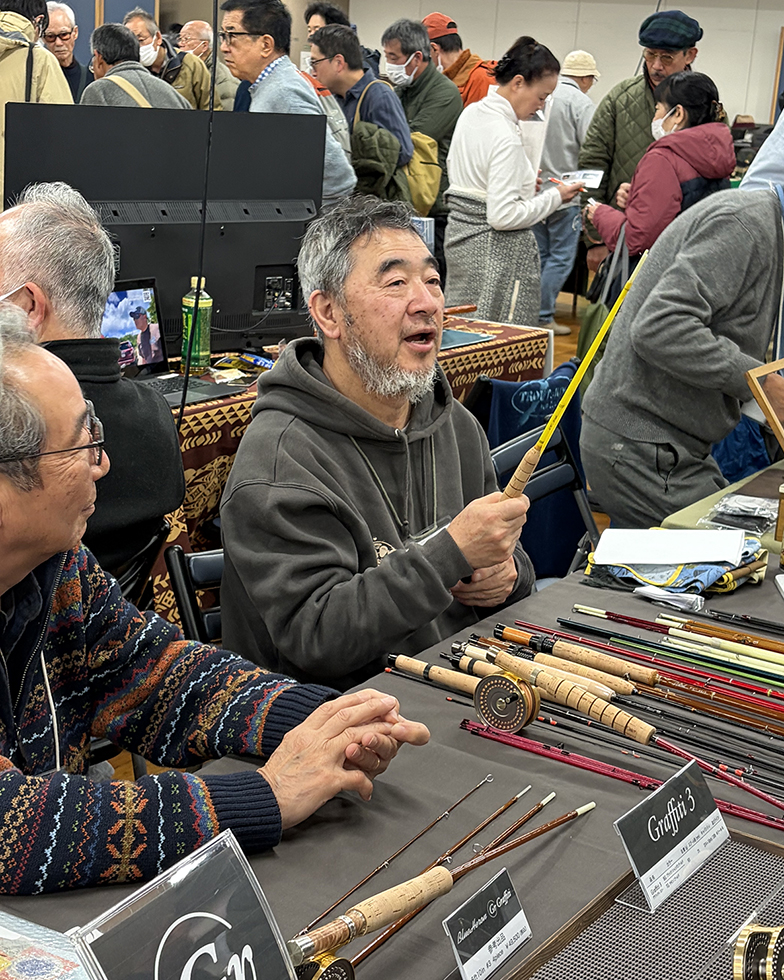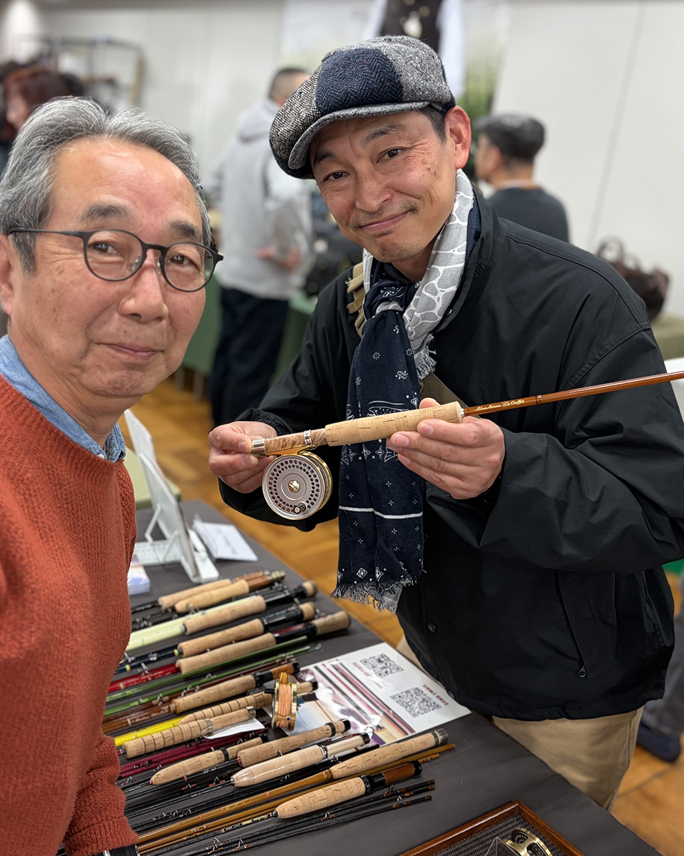大好きなフォトグラファーでもある佐藤成史さん、昨年 Silky Wood様の桂川フィッシングスクールでお世話になりました。佐藤さんの出展ブースは我々の斜め前。フライリールを手に取って見てくださいました。