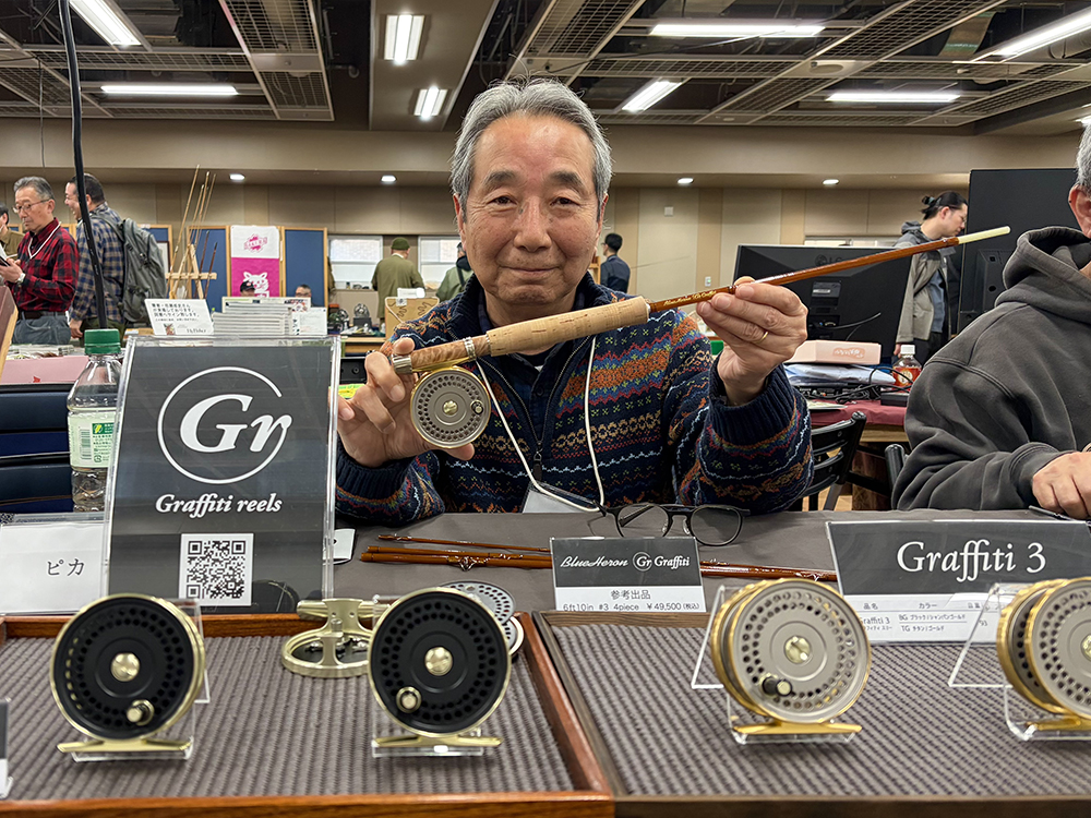 さらには出展に先立ち、Bule Heron Rods様(数本のフライロッドを愛用中)にグラスロッドをお願いし打ち合わせをさせていただいたが、その場で意気投合し、BlueHeron Rods × Graffiti reelsのダブルネームによる特別なグラスロッド【BlueHeron Graffiti 6’10”】を製作いただけることに。