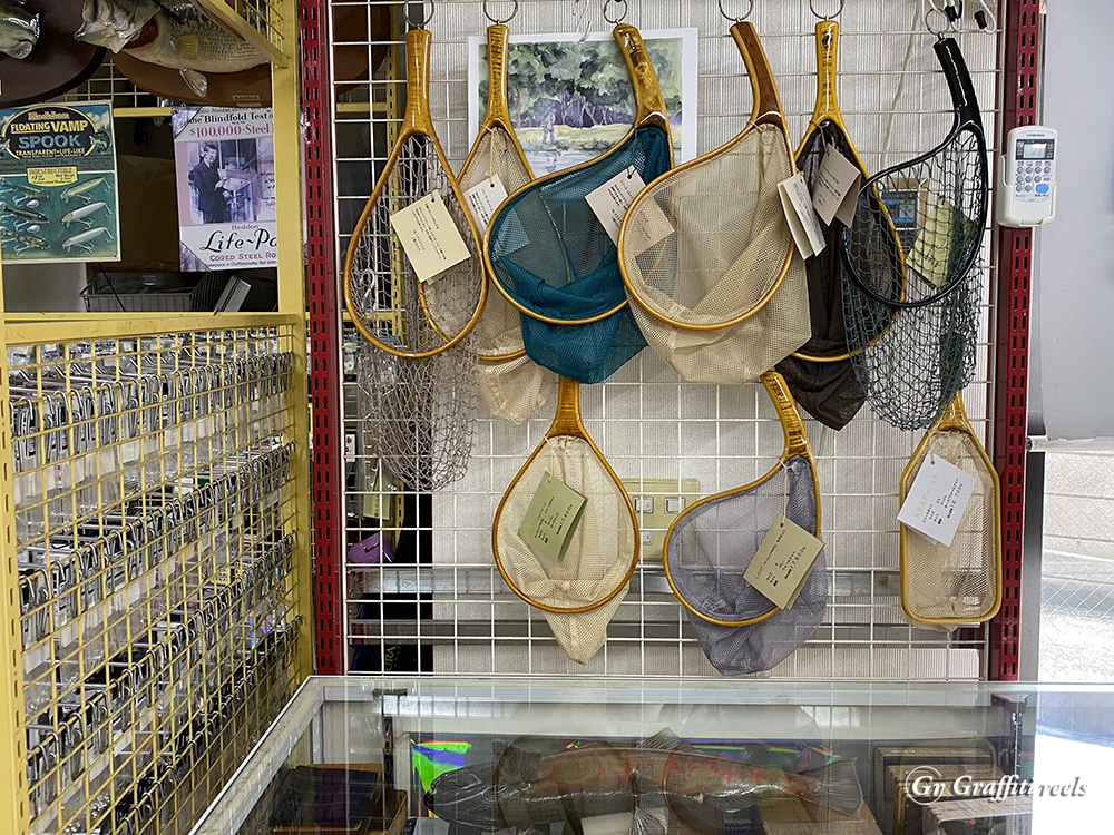 リールが収まるガラスケースカウンターの背後には、ずらっとバンブーロッド、フライフック、などなど。
