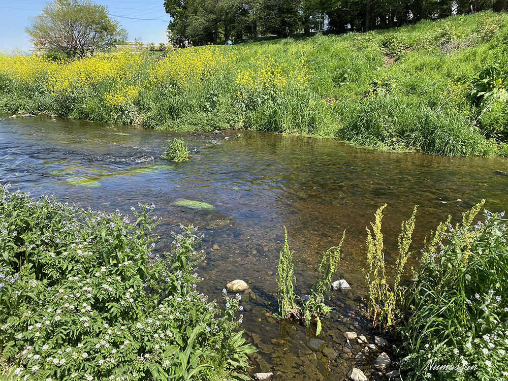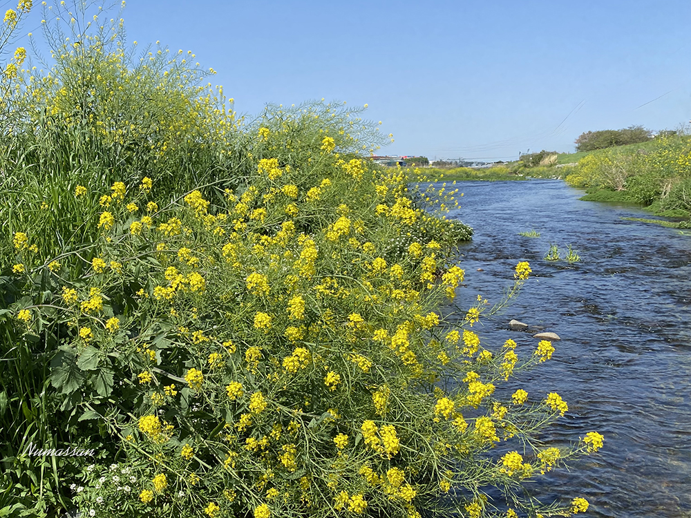 桜からの春爛漫リレーで川原はいきいき。今日も水不足気味だが、上流の河川工事の影響でずっと不調続き、なんとかオイカワを釣りたい。