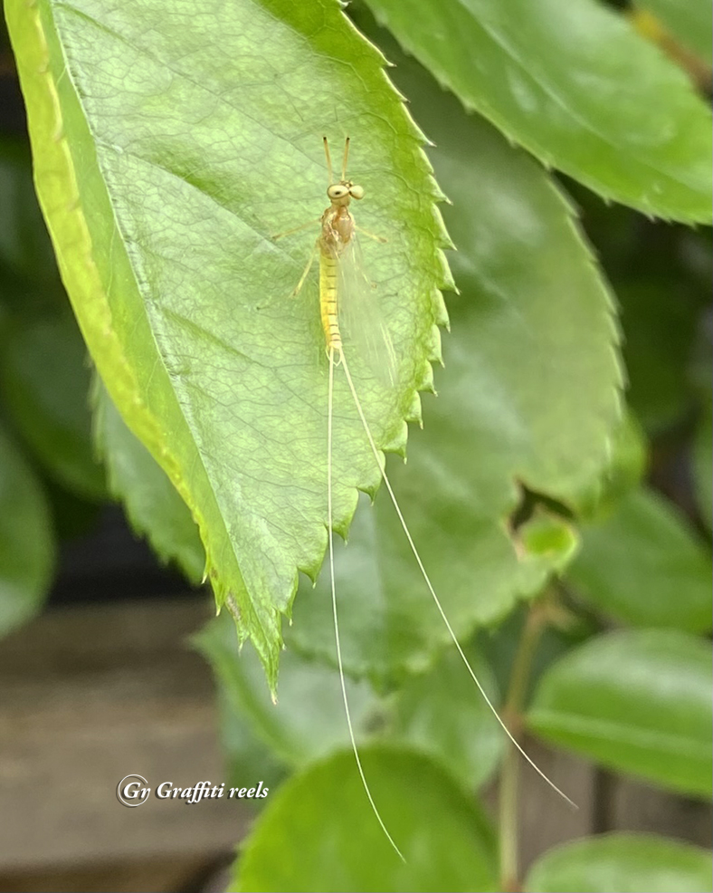 帰宅すると庭のモッコウバラの葉陰にカゲロウがいたよ。