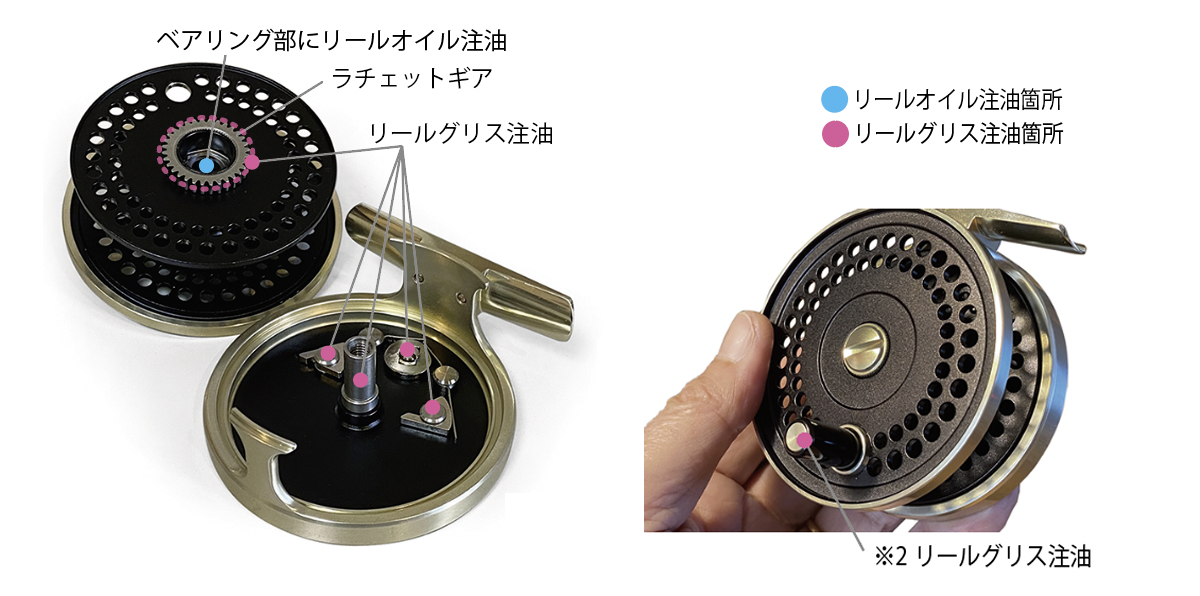 オイルはグリスに比べて低粘度なのでベアリング部に、グリスはオイルに比べて負荷がかかる場所やノイズが気になるスプール軸、ハンドルノブ軸(右※2)、ラチェット/ラチェットギアの部位などに注油することで、初期性能を維持することができます。その他の部分はオイルを浸した布で軽く拭いてください。